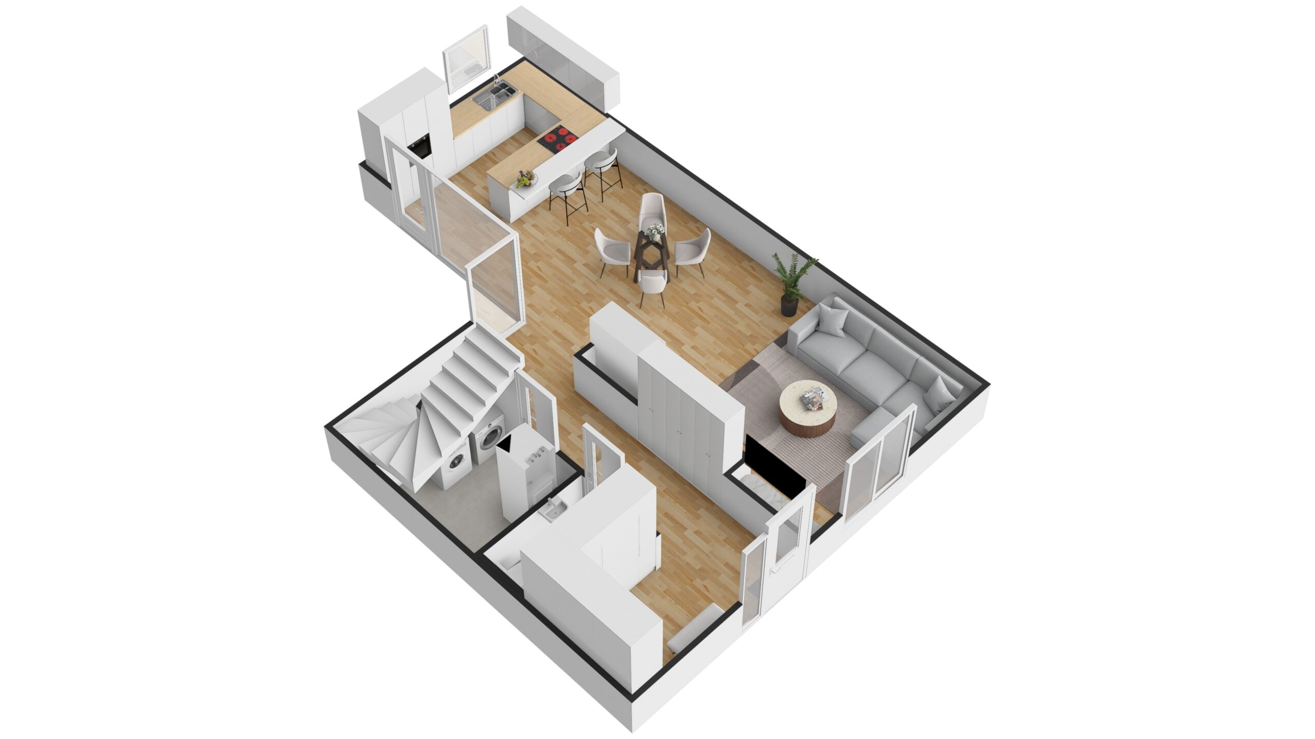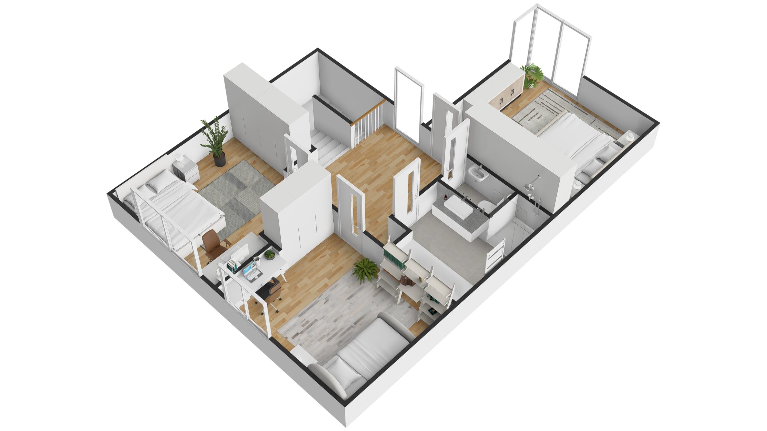 Dům je dvoupodlažní, rozdělen na společenskou část v přízemí a klidovou zónu v patře.