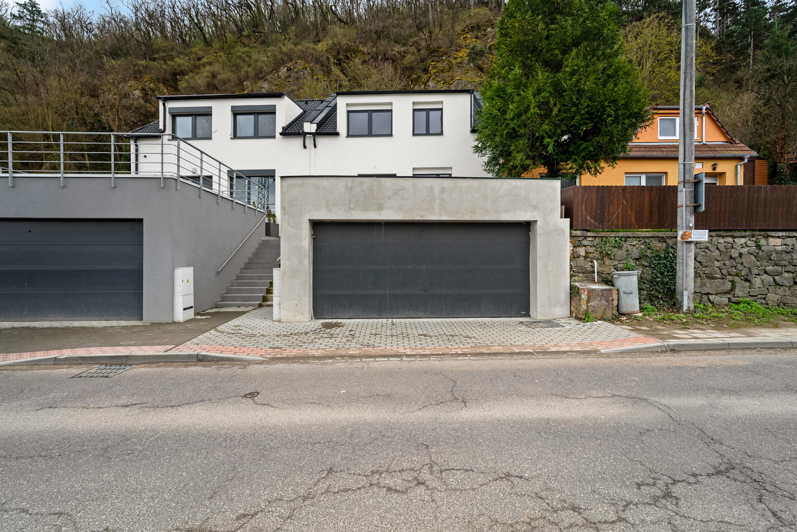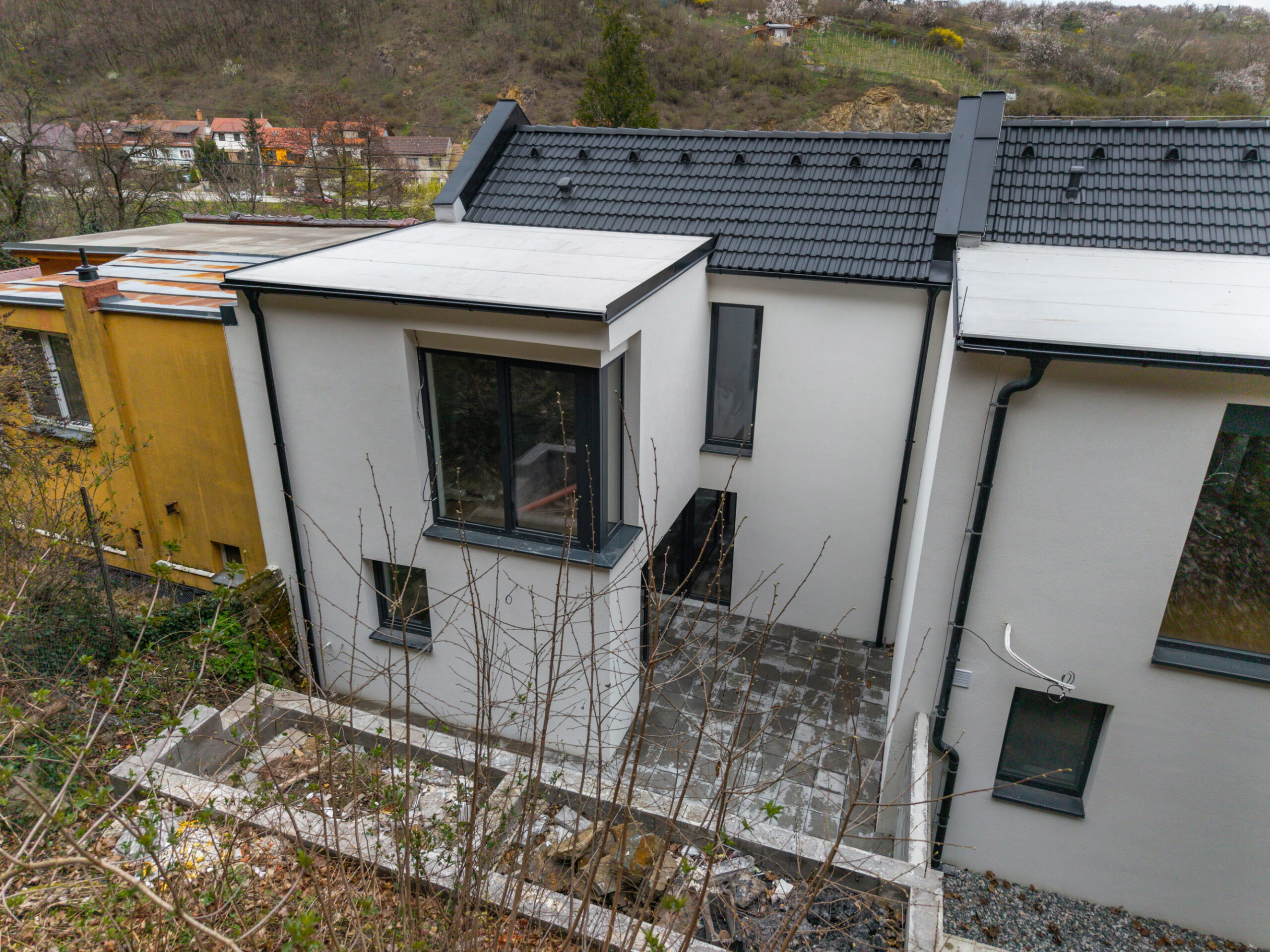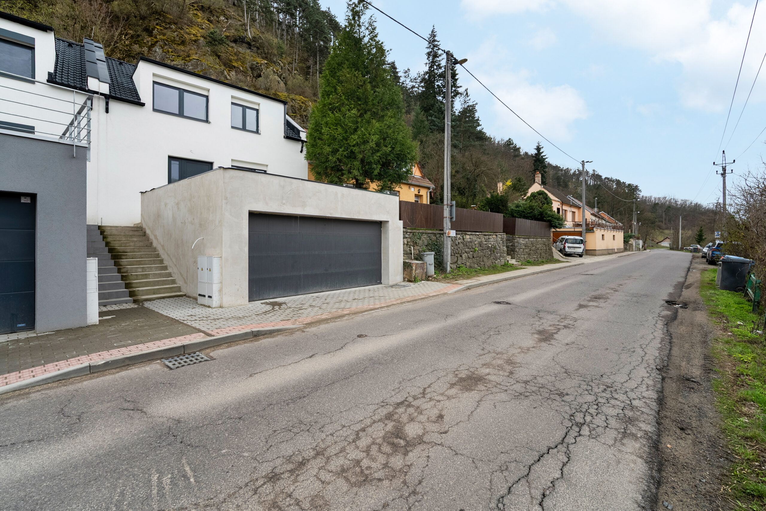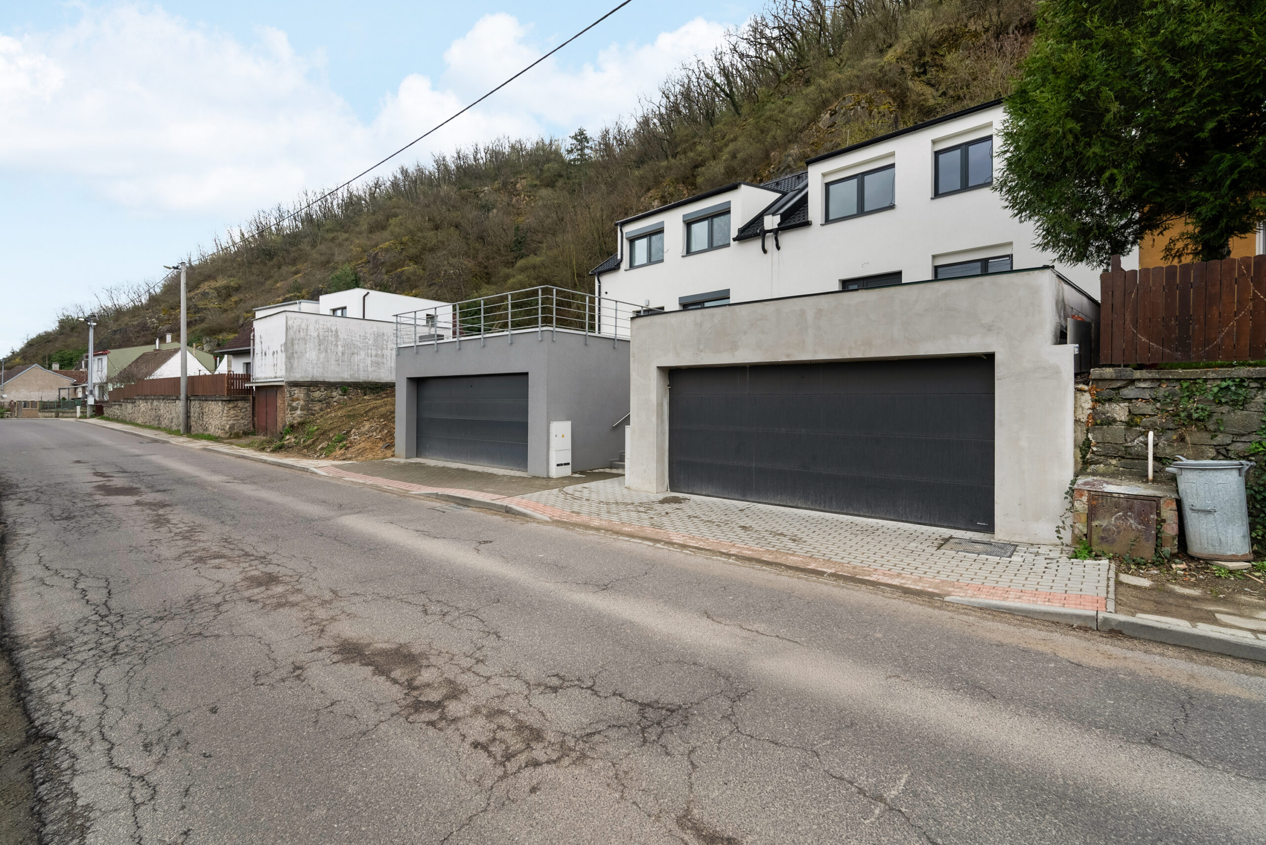 Nízkoenergetická novostavba 4+kk v obci Dolní Kounice na ulice Skalní. V projektové dokumentaci označen jako RD 1, při pohledu z ulice dům vpravo. LV 3223, k. ú. Dolní Kounice. Celková užitná plocha dle PD 179 m².