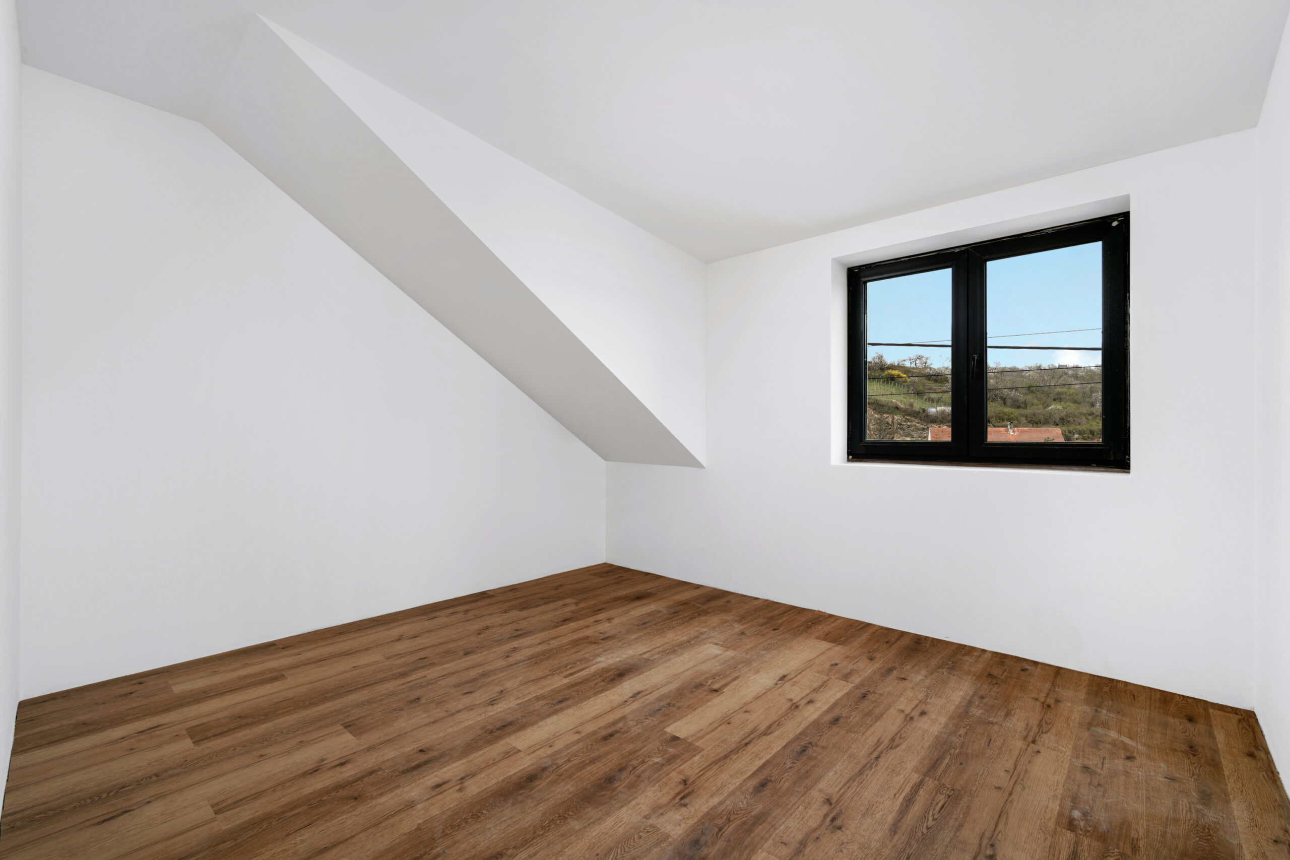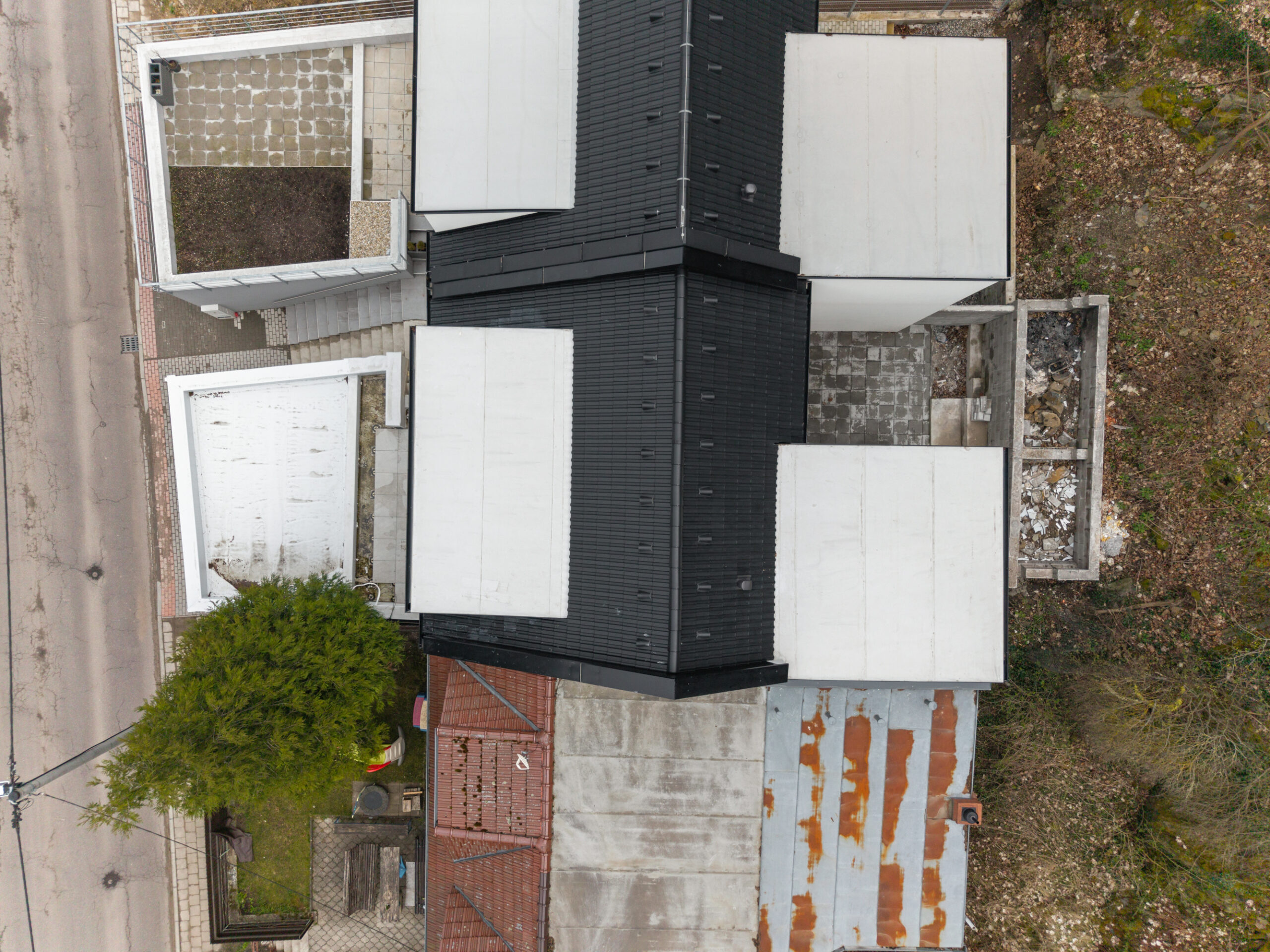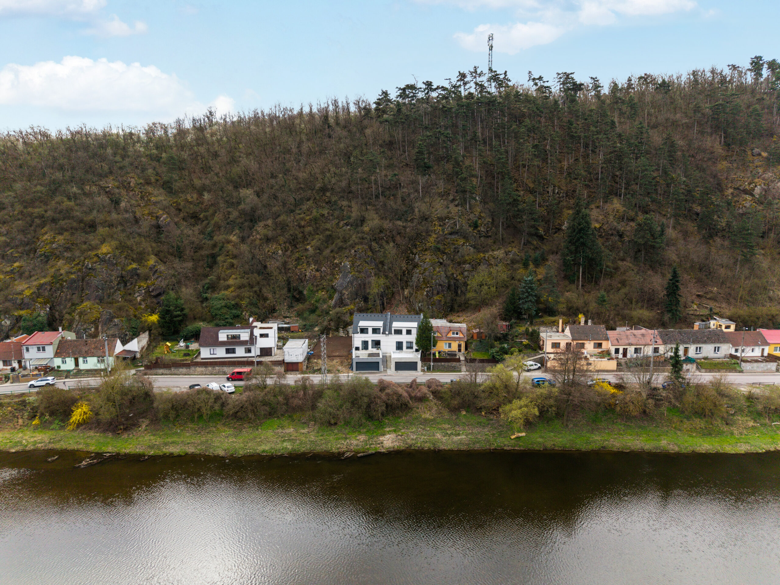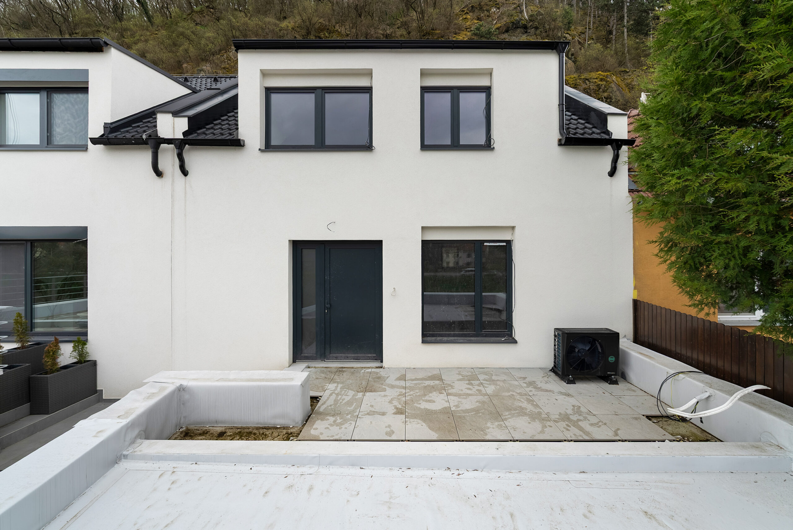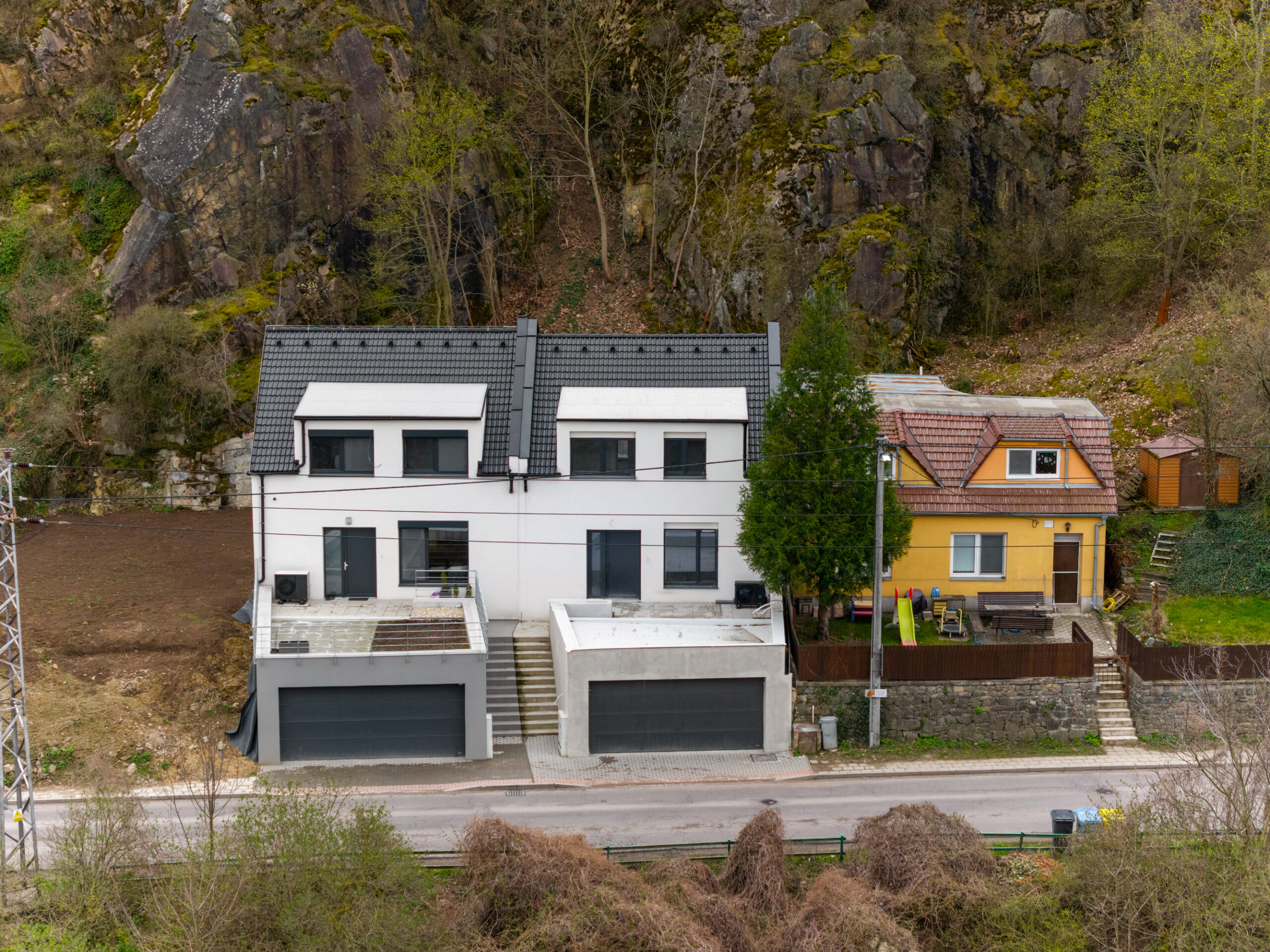 Nízkoenergetická novostavba 4+kk v obci Dolní Kounice na ulice Skalní. V projektové dokumentaci označen jako RD 1, při pohledu z ulice dům vpravo. LV 3223, k. ú. Dolní Kounice. Celková užitná plocha dle PD 179 m².